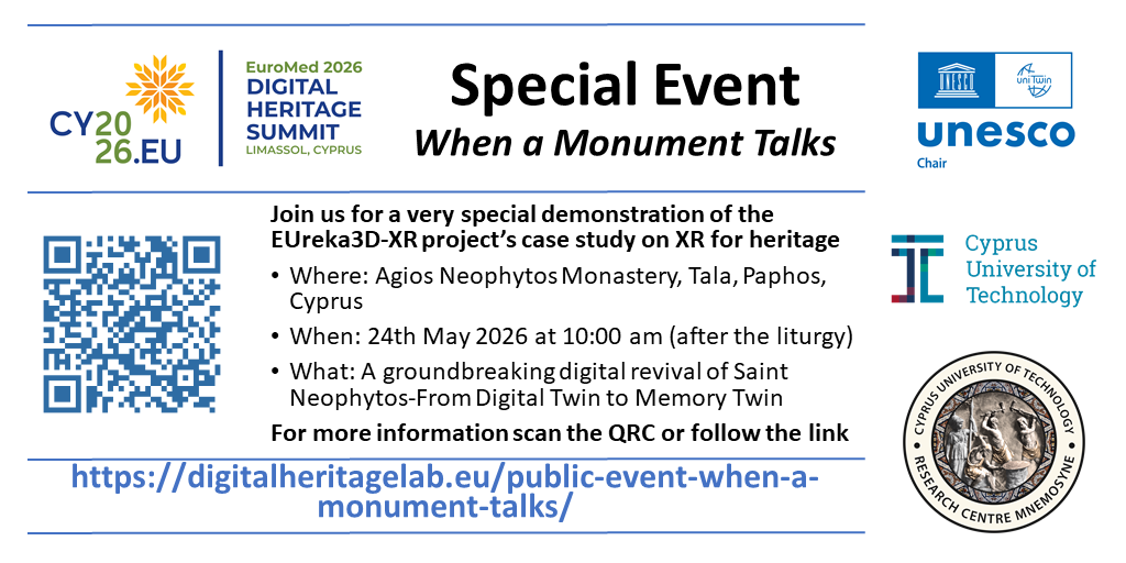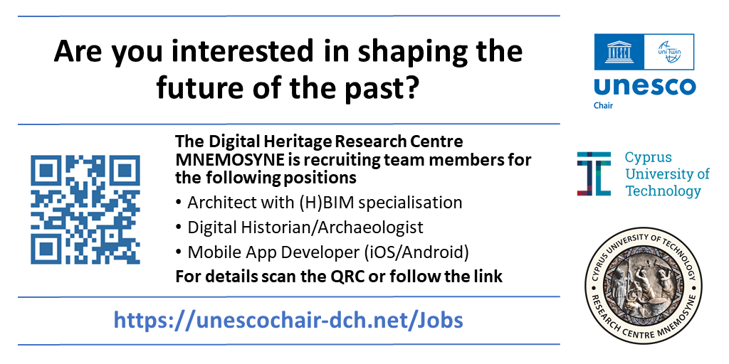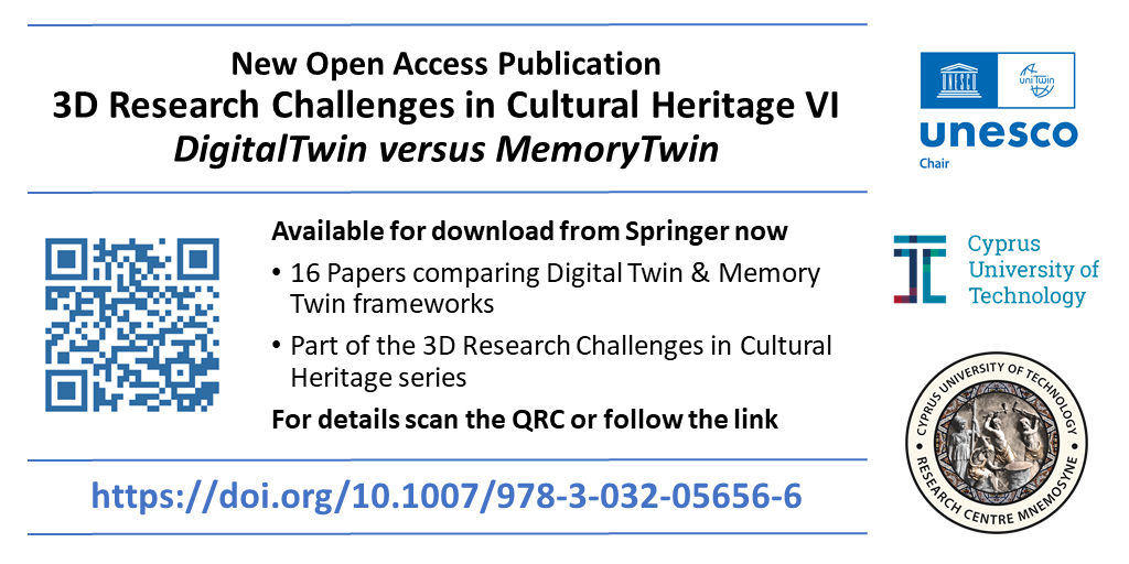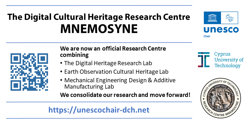 The Research Centre MNEMOSYNE is a newly established institution under the unique UNESCO Chair on Digital Cultural Heritage at the Cyprus University of Technology, established by Cyprus Law (CY Law) as a permanent structure for research, education, innovation and development in cultural heritage. It is the flagship outcome of the H2020 ERA Chair on Digital Cultural Heritage, a landmark EU-funded project and the result of the strategic merger of three pioneering labs: